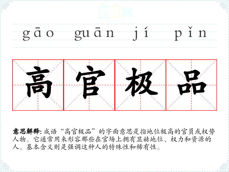 成语“高官极品”的字面意思是指地位极高的官员或权势人物。它通常用来形容那些在官场上拥有显赫地位、权力和资源的人。基本含义则是强调这种人的特殊性和稀有性。