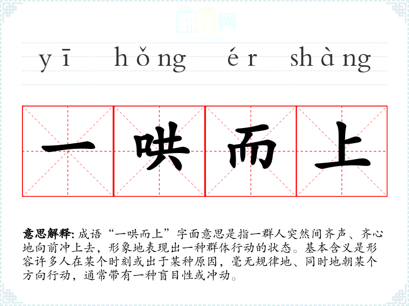 成语“一哄而上”字面意思是指一群人突然间齐声、齐心地向前冲上去,形象地表现出一种群体行动的状态。基本含义是形容许多人在某个时刻或出于某种原因,毫无规律地、同时地朝某个方向行动,通常带有一种盲目性或冲动。
