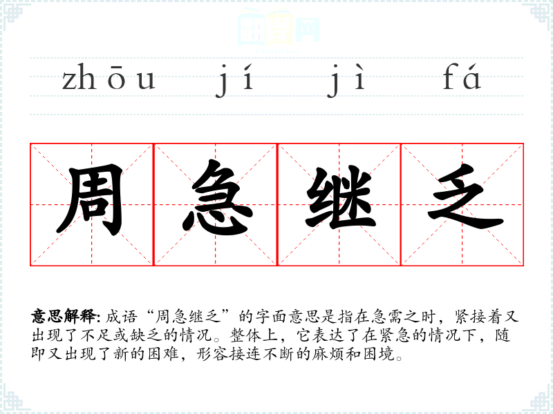 成语“周急继乏”的字面意思是指在急需之时,紧接着又出现了不足或缺乏的情况。整体上,它表达了在紧急的情况下,随即又出现了新的困难,形容接连不断的麻烦和困境。