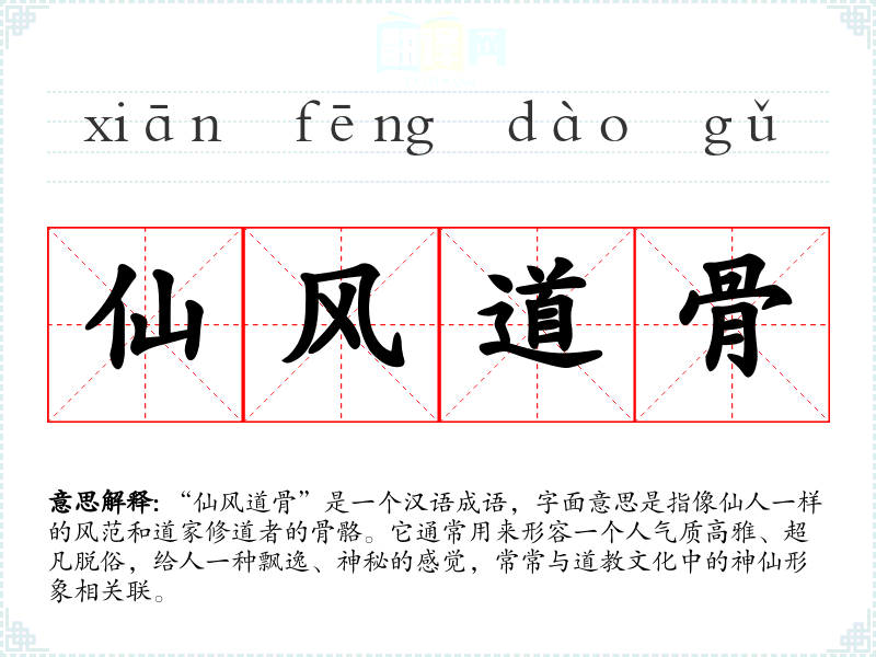 “仙风道骨”是一个汉语成语,字面意思是指像仙人一样的风范和道家修道者的骨骼。它通常用来形容一个人气质高雅、超凡脱俗,给人一种飘逸、神秘的感觉,常常与道教文化中的神仙形象相关联。
