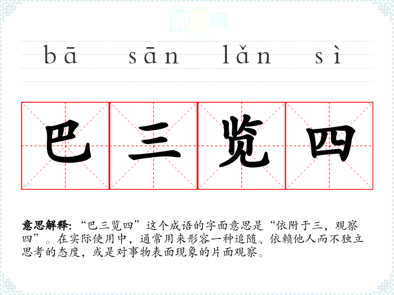 “巴三览四”这个成语的字面意思是“依附于三,观察四”。在实际使用中,通常用来形容一种追随、依赖他人而不独立思考的态度,或是对事物表面现象的片面观察。