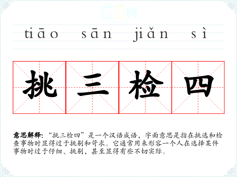 “挑三检四”是一个汉语成语,字面意思是指在挑选和检查事物时显得过于挑剔和苛求。它通常用来形容一个人在选择某件事物时过于仔细、挑剔,甚至显得有些不切实际。