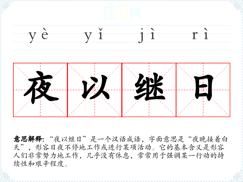 “夜以继日”是一个汉语成语,字面意思是“夜晚接着白天”,形容日夜不停地工作或进行某项活动。它的基本含义是形容人们非常努力地工作,几乎没有休息,常常用于强调某一行动的持续性和艰辛程度。