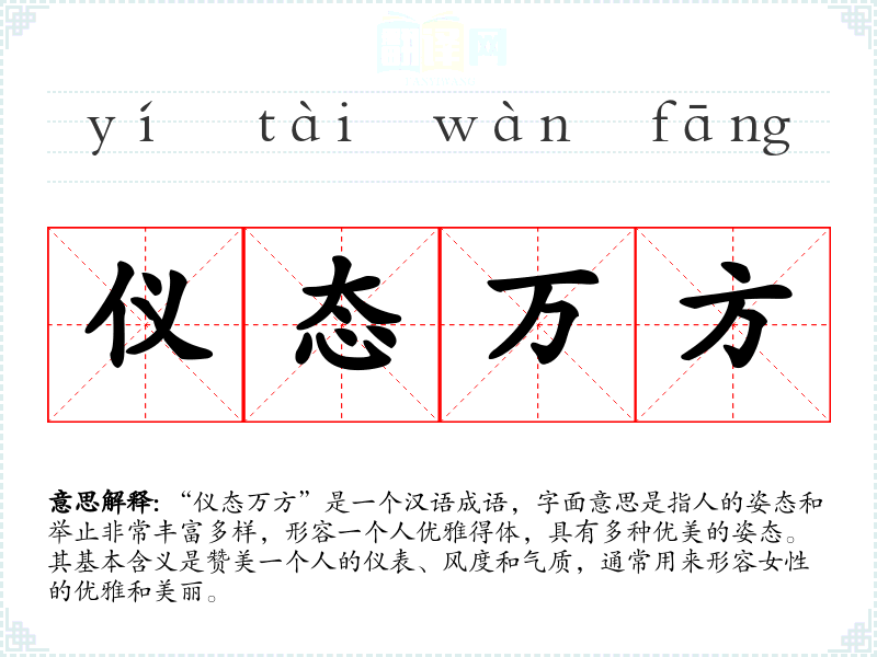 “仪态万方”是一个汉语成语,字面意思是指人的姿态和举止非常丰富多样,形容一个人优雅得体,具有多种优美的姿态。其基本含义是赞美一个人的仪表、风度和气质,通常用来形容女性的优雅和美丽。