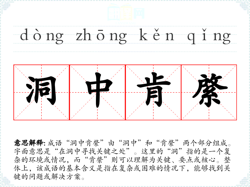 成语“洞中肯綮”由“洞中”和“肯綮”两个部分组成。字面意思是“在洞中寻找关键之处”。这里的“洞”指的是一个复杂的环境或情况,而“肯綮”则可以理解为关键、要点或核心。整体上,该成语的基本含义是指在复杂或困难的情况下,能够找到关键的问题或解决方案。