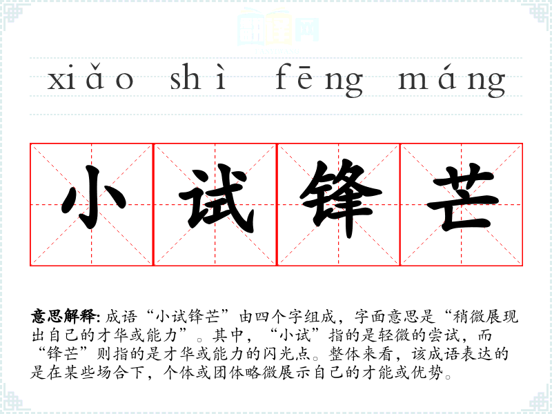 “小试锋芒”这个成语的具体来源并不明确,但它常被用来形容年轻人或初入某个领域的人在适当的场合中展露出自己的才华。可以追溯到古代文人对自我表现的追求,尤其在科举制度盛行的时代,学子们常常在各种场合展现自己的才华,以求得更好的发展机会。