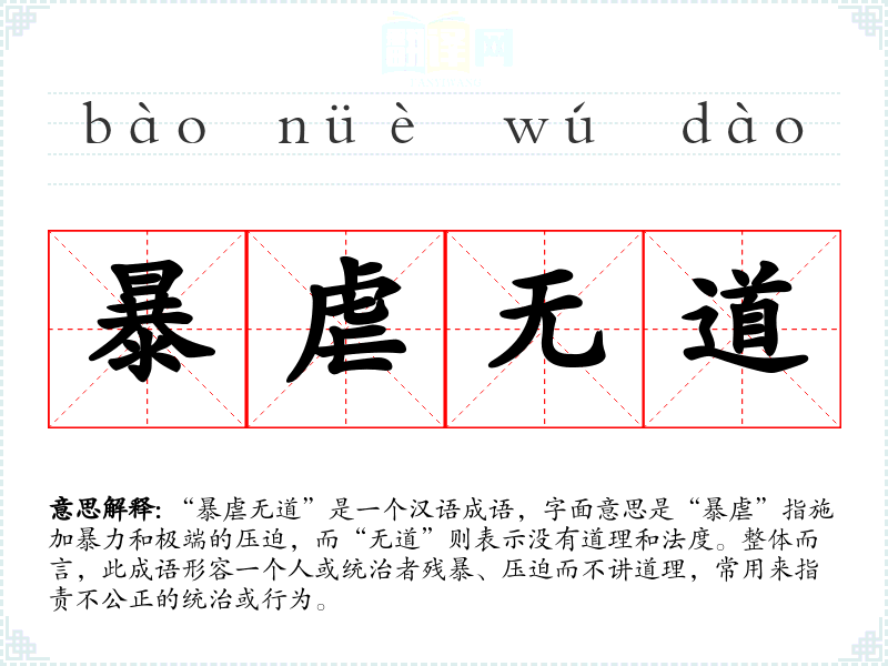 “暴虐无道”是一个汉语成语,字面意思是“暴虐”指施加暴力和极端的压迫,而“无道”则表示没有道理和法度。整体而言,此成语形容一个人或统治者残暴、压迫而不讲道理,常用来指责不公正的统治或行为。