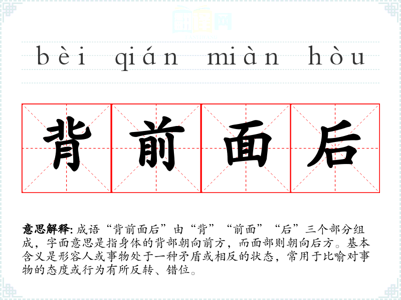- 日常对话:用于形容某人言行不一致,例如“他总是背前面后,今天说要努力,明天就又懈怠了。”