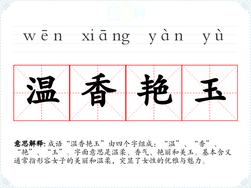 “温香艳玉”并没有明确的历史典故或文献出处,但其构成的字词在古代文学中常用于描述女性的美丽。词语中的“香”、“艳”、“玉”均为传统文化中用来形容女性特质的词汇,具有深厚的文化积淀。