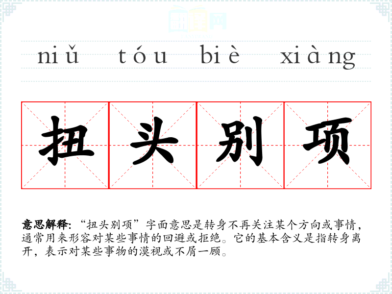 “扭头别项”字面意思是转身不再关注某个方向或事情,通常用来形容对某些事情的回避或拒绝。它的基本含义是指转身离开,表示对某些事物的漠视或不屑一顾。