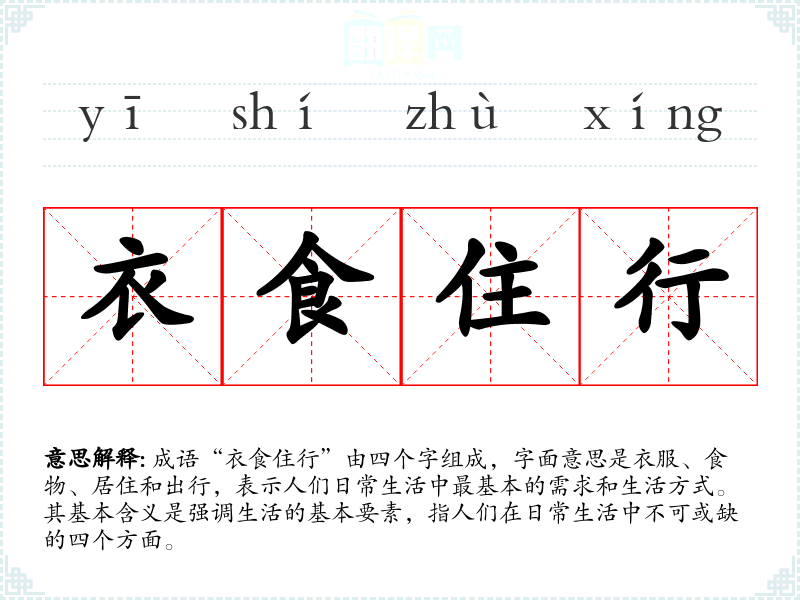 成语“衣食住行”由四个字组成,字面意思是衣服、食物、居住和出行,表示人们日常生活中最基本的需求和生活方式。其基本含义是强调生活的基本要素,指人们在日常生活中不可或缺的四个方面。