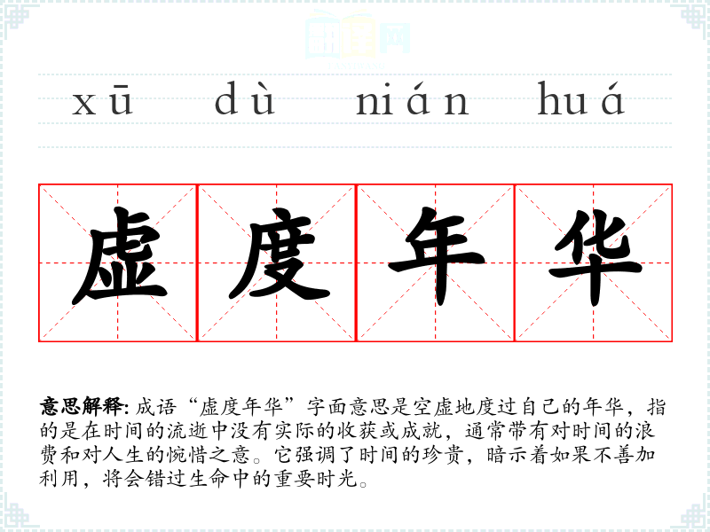 “虚度年华”并没有明确的历史典故,但其构成的两个词“虚度”和“年华”在古典文学中都有相应的使用。“虚度”指的是空耗时间而不做有意义的事情,“年华”则常用来指代年轻的岁月。这个成语可以看作是一种对人生意义的反思,提醒人们珍惜时光,努力奋斗。