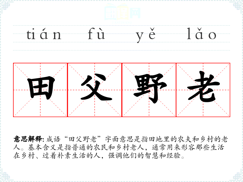 成语“田父野老”字面意思是指田地里的农夫和乡村的老人。基本含义是指普通的农民和乡村老人,通常用来形容那些生活在乡村、过着朴素生活的人,强调他们的智慧和经验。