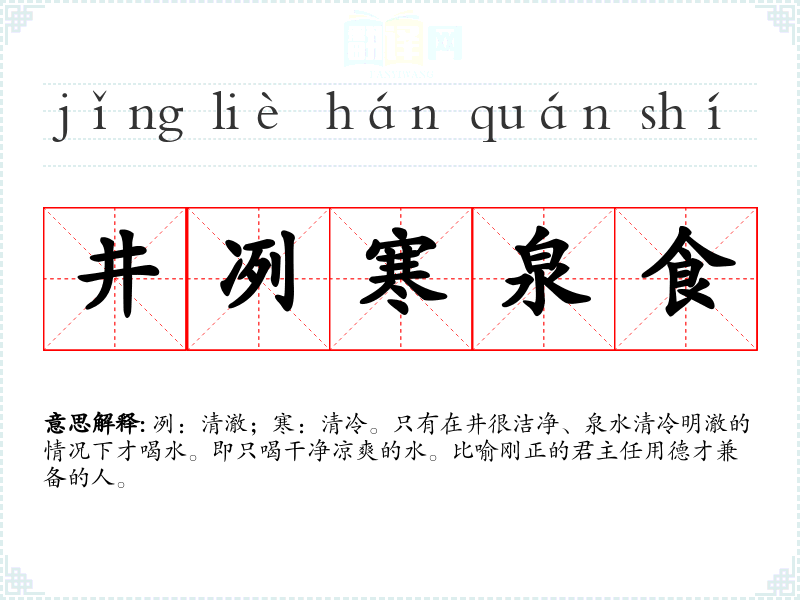| 井冽寒泉食 | 冽:清澈;寒:清冷。只有在井很洁净、泉水清冷明澈的情况下才喝水。即只喝干净凉爽的水。比喻刚正的君主任用德才兼备的人。 |