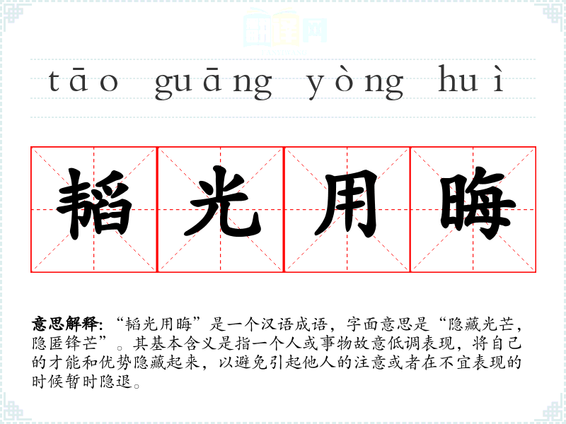 “韬光用晦”是一个汉语成语,字面意思是“隐藏光芒,隐匿锋芒”。其基本含义是指一个人或事物故意低调表现,将自己的才能和优势隐藏起来,以避免引起他人的注意或者在不宜表现的时候暂时隐退。