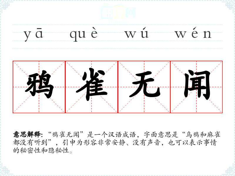 “鸦雀无闻”是一个汉语成语,字面意思是“乌鸦和麻雀都没有听到”,引申为形容非常安静、没有声音,也可以表示事情的秘密性和隐秘性。