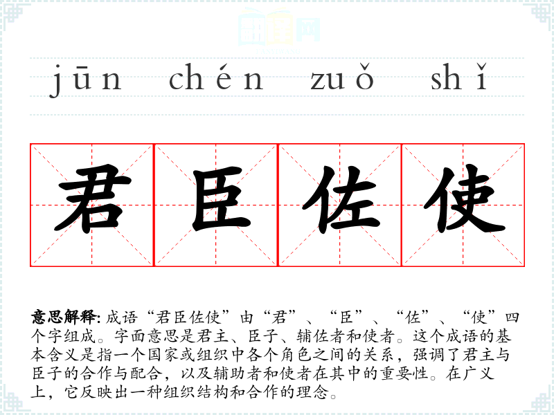 成语“君臣佐使”由“君”、“臣”、“佐”、“使”四个字组成。字面意思是君主、臣子、辅佐者和使者。这个成语的基本含义是指一个国家或组织中各个角色之间的关系,强调了君主与臣子的合作与配合,以及辅助者和使者在其中的重要性。在广义上,它反映出一种组织结构和合作的理念。