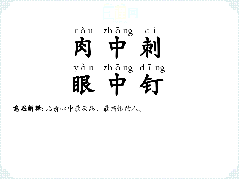 | 眼中钉 | 比喻心中最厌恶、最痛恨的人。 |