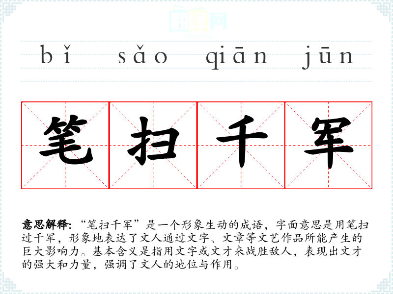 “笔扫千军”是一个形象生动的成语,字面意思是用笔扫过千军,形象地表达了文人通过文字、文章等文艺作品所能产生的巨大影响力。基本含义是指用文字或文才来战胜敌人,表现出文才的强大和力量,强调了文人的地位与作用。
