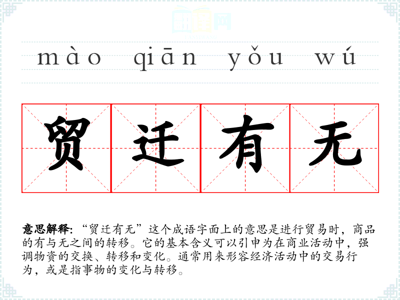 “贸迁有无”这个成语字面上的意思是进行贸易时,商品的有与无之间的转移。它的基本含义可以引申为在商业活动中,强调物资的交换、转移和变化。通常用来形容经济活动中的交易行为,或是指事物的变化与转移。