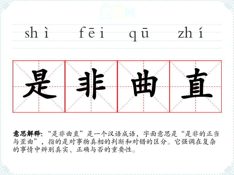 “是非曲直”是一个汉语成语,字面意思是“是非的正当与歪曲”,指的是对事物真相的判断和对错的区分。它强调在复杂的事情中辨别真实、正确与否的重要性。