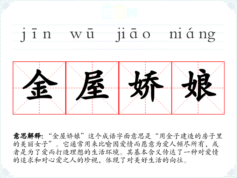 “金屋娇娘”这个成语字面意思是“用金子建造的房子里的美丽女子”。它通常用来比喻因爱情而愿意为爱人倾尽所有,或者是为了爱而打造理想的生活环境。其基本含义传达了一种对爱情的追求和对心爱之人的珍视,体现了对美好生活的向往。