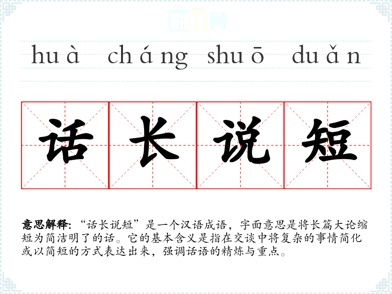 “话长说短”是一个汉语成语,字面意思是将长篇大论缩短为简洁明了的话。它的基本含义是指在交谈中将复杂的事情简化或以简短的方式表达出来,强调话语的精炼与重点。