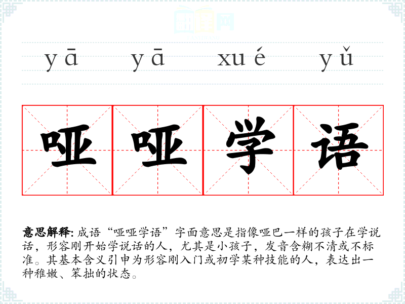 成语“哑哑学语”字面意思是指像哑巴一样的孩子在学说话,形容刚开始学说话的人,尤其是小孩子,发音含糊不清或不标准。其基本含义引申为形容刚入门或初学某种技能的人,表达出一种稚嫩、笨拙的状态。