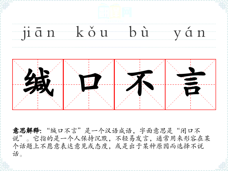 “缄口不言”是一个汉语成语,字面意思是“闭口不说”。它指的是一个人保持沉默,不轻易发言,通常用来形容在某个话题上不愿意表达意见或态度,或是出于某种原因而选择不说话。