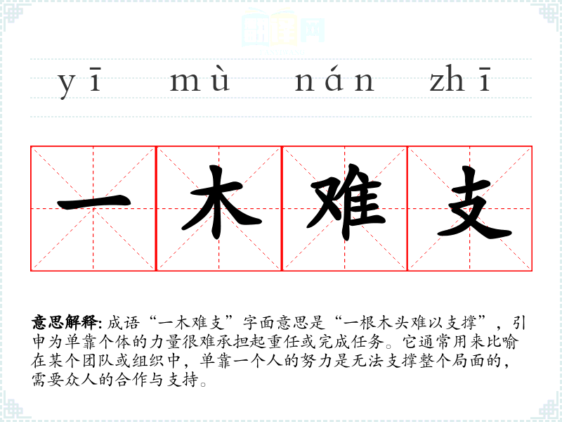成语“一木难支”字面意思是“一根木头难以支撑”,引申为单靠个体的力量很难承担起重任或完成任务。它通常用来比喻在某个团队或组织中,单靠一个人的努力是无法支撑整个局面的,需要众人的合作与支持。