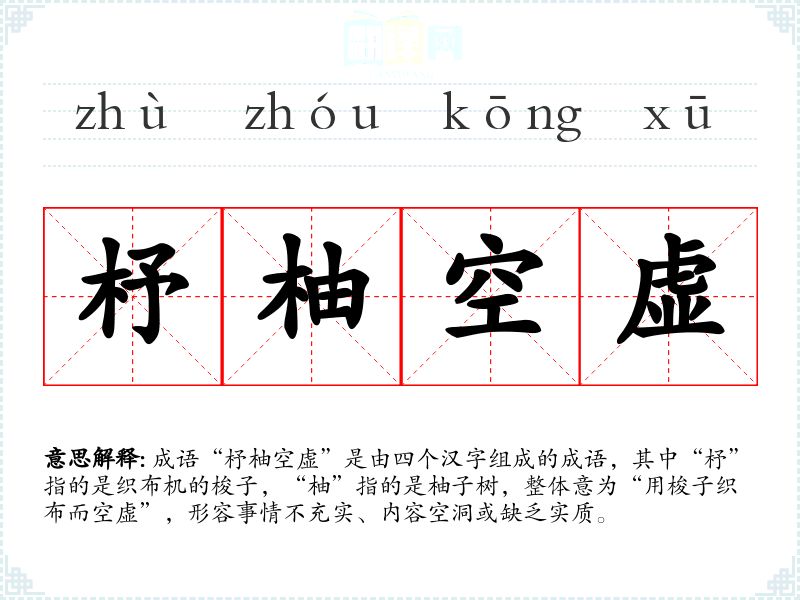 成语“杼柚空虚”是由四个汉字组成的成语,其中“杼”指的是织布机的梭子,“柚”指的是柚子树,整体意为“用梭子织布而空虚”,形容事情不充实、内容空洞或缺乏实质。