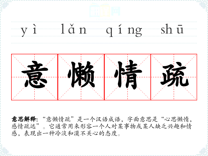 “意懒情疏”是一个汉语成语,字面意思是“心思懒惰,感情疏远”。它通常用来形容一个人对某事物或某人缺乏兴趣和情感,表现出一种冷淡和漠不关心的态度。