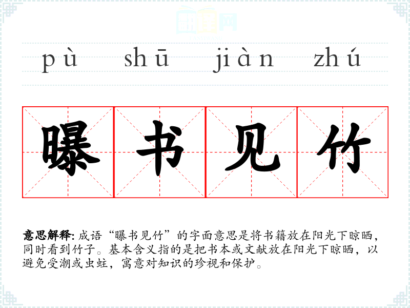 成语“曝书见竹”的字面意思是将书籍放在阳光下晾晒,同时看到竹子。基本含义指的是把书本或文献放在阳光下晾晒,以避免受潮或虫蛀,寓意对知识的珍视和保护。
