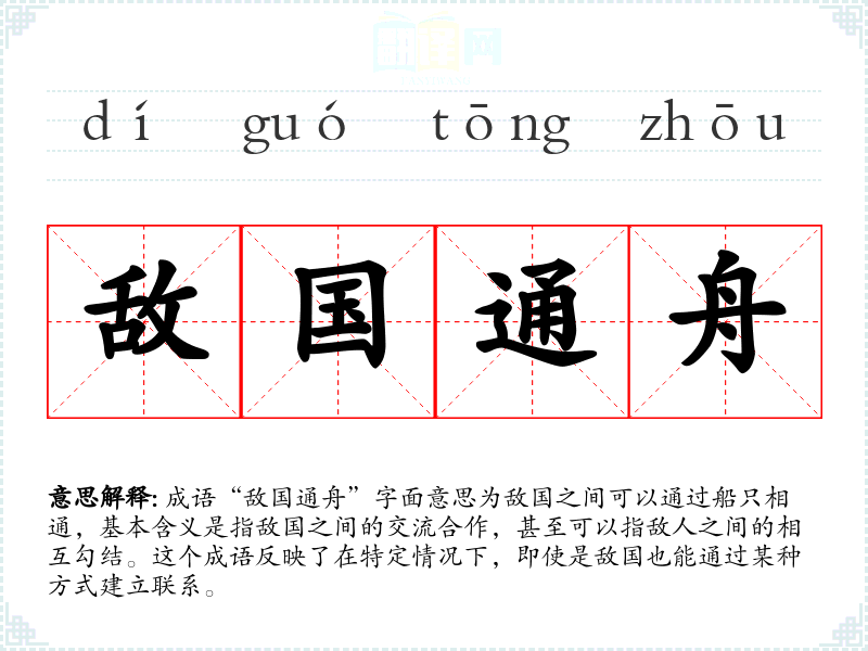 成语“敌国通舟”字面意思为敌国之间可以通过船只相通,基本含义是指敌国之间的交流合作,甚至可以指敌人之间的相互勾结。这个成语反映了在特定情况下,即使是敌国也能通过某种方式建立联系。