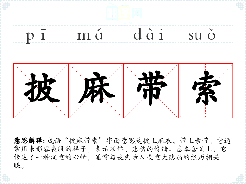 成语“披麻带索”字面意思是披上麻衣,带上索带。它通常用来形容丧服的样子,表示哀悼、悲伤的情绪。基本含义上,它传达了一种沉重的心情,通常与丧失亲人或重大悲痛的经历相关联。