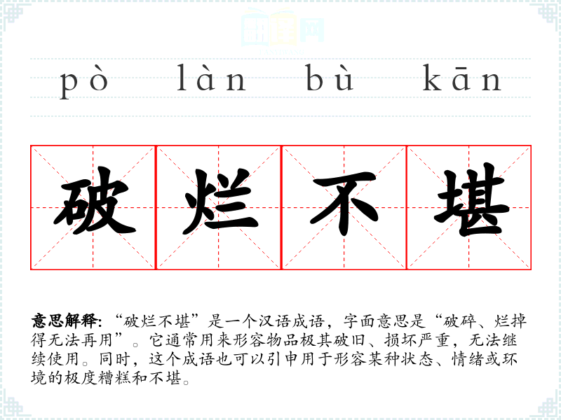 “破烂不堪”是一个汉语成语,字面意思是“破碎、烂掉得无法再用”。它通常用来形容物品极其破旧、损坏严重,无法继续使用。同时,这个成语也可以引申用于形容某种状态、情绪或环境的极度糟糕和不堪。