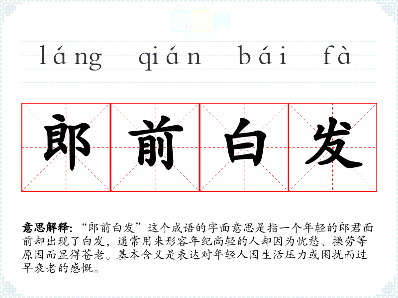 “郎前白发”并非一个历史悠久的成语,更多的是一种描述性的表达,可能源自古代文学中对青春与衰老对比的描写。在一些古代诗词中,常常会提到年轻人因愁苦而显得老态的情景,反映了人们对生命短暂和忧虑的思考。