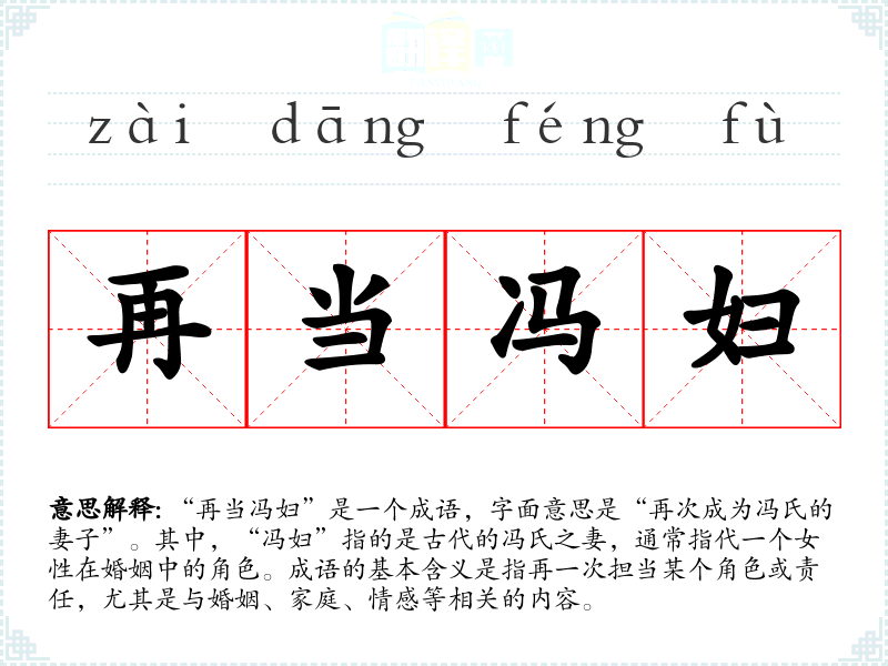 “再当冯妇”是一个成语,字面意思是“再次成为冯氏的妻子”。其中,“冯妇”指的是古代的冯氏之妻,通常指代一个女性在婚姻中的角色。成语的基本含义是指再一次担当某个角色或责任,尤其是与婚姻、家庭、情感等相关的内容。