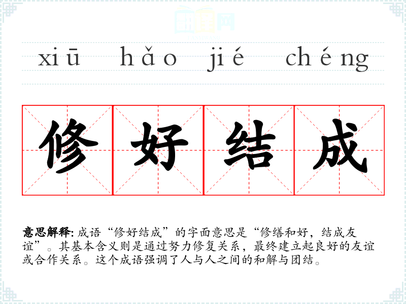 成语“修好结成”的字面意思是“修缮和好,结成友谊”。其基本含义则是通过努力修复关系,最终建立起良好的友谊或合作关系。这个成语强调了人与人之间的和解与团结。