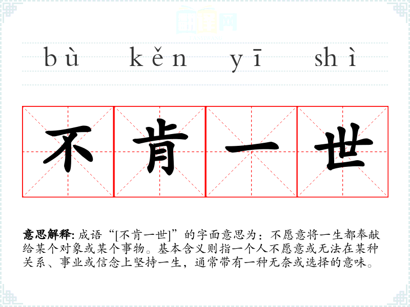 成语“[不肯一世]”的字面意思为:不愿意将一生都奉献给某个对象或某个事物。基本含义则指一个人不愿意或无法在某种关系、事业或信念上坚持一生,通常带有一种无奈或选择的意味。