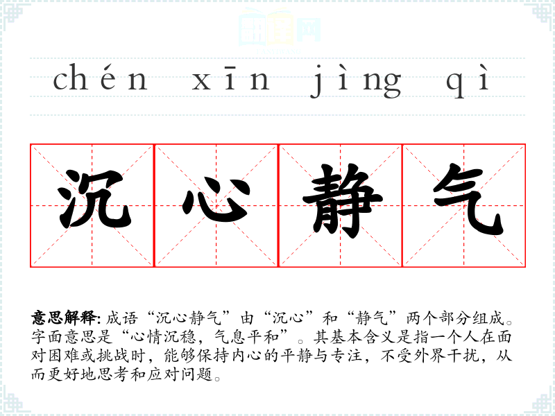 成语“沉心静气”由“沉心”和“静气”两个部分组成。字面意思是“心情沉稳,气息平和”。其基本含义是指一个人在面对困难或挑战时,能够保持内心的平静与专注,不受外界干扰,从而更好地思考和应对问题。
