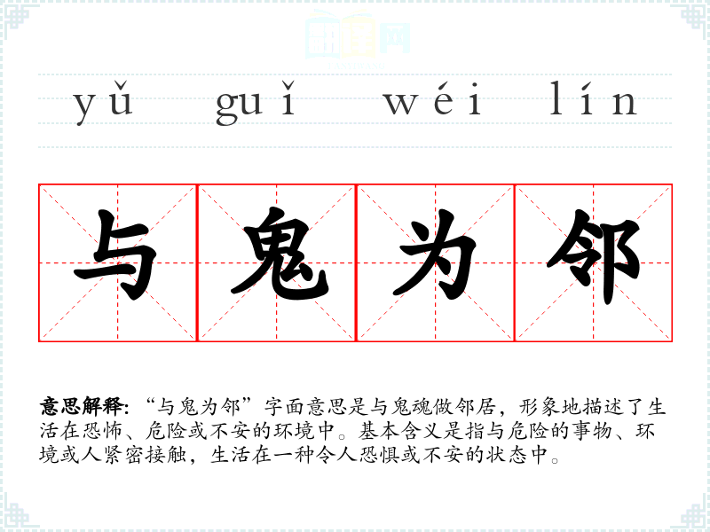 “与鬼为邻”字面意思是与鬼魂做邻居,形象地描述了生活在恐怖、危险或不安的环境中。基本含义是指与危险的事物、环境或人紧密接触,生活在一种令人恐惧或不安的状态中。