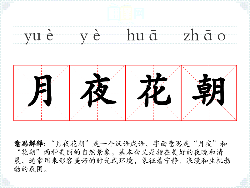 “月夜花朝”是一个汉语成语,字面意思是“月夜”和“花朝”两种美丽的自然景象。基本含义是指在美好的夜晚和清晨,通常用来形容美好的时光或环境,象征着宁静、浪漫和生机勃勃的氛围。