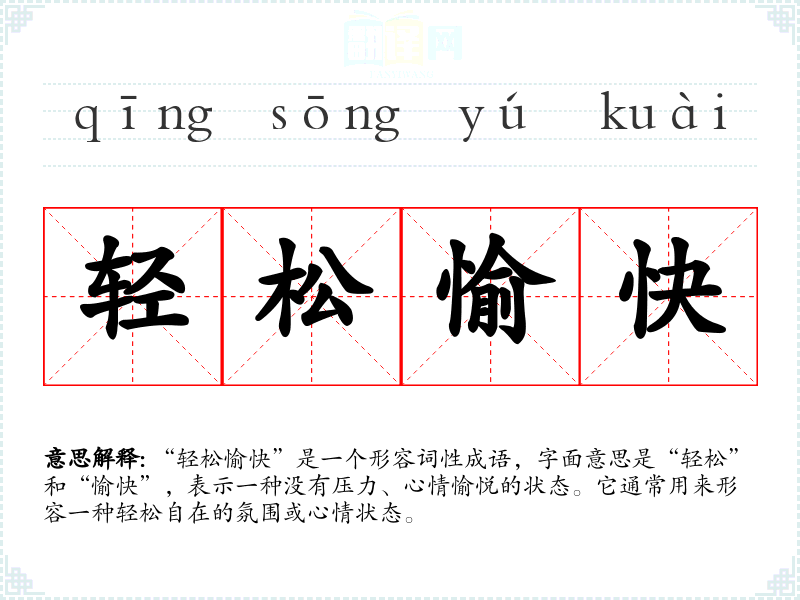 “轻松愉快”是一个形容词性成语,字面意思是“轻松”和“愉快”,表示一种没有压力、心情愉悦的状态。它通常用来形容一种轻松自在的氛围或心情状态。