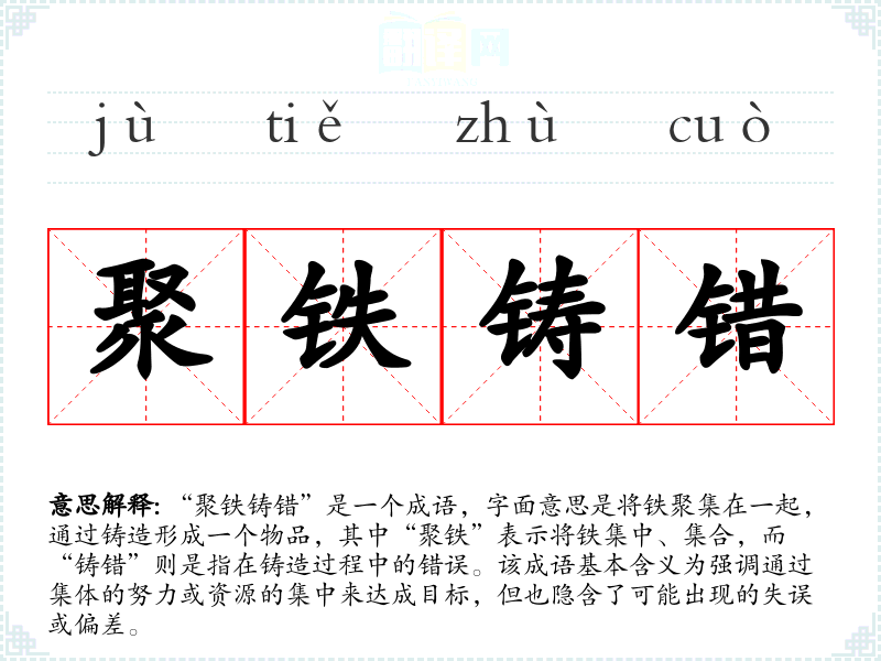 “聚铁铸错”是一个成语,字面意思是将铁聚集在一起,通过铸造形成一个物品,其中“聚铁”表示将铁集中、集合,而“铸错”则是指在铸造过程中的错误。该成语基本含义为强调通过集体的努力或资源的集中来达成目标,但也隐含了可能出现的失误或偏差。