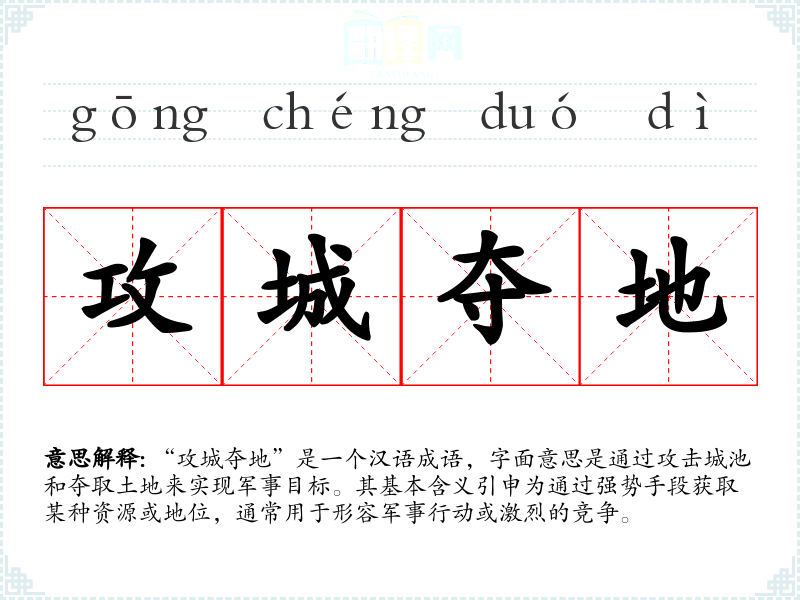 “攻城夺地”是一个汉语成语,字面意思是通过攻击城池和夺取土地来实现军事目标。其基本含义引申为通过强势手段获取某种资源或地位,通常用于形容军事行动或激烈的竞争。