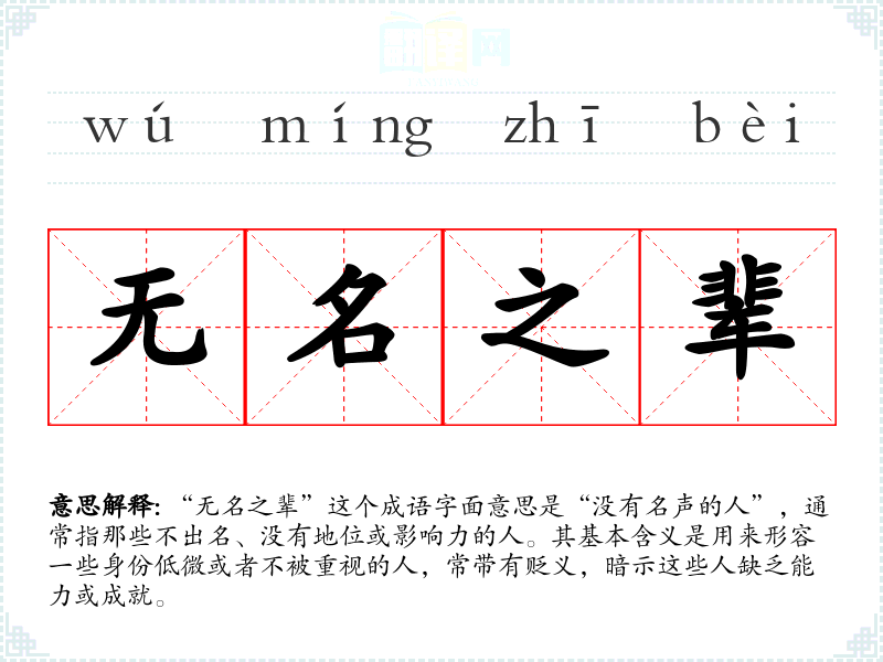 “无名之辈”这个成语字面意思是“没有名声的人”,通常指那些不出名、没有地位或影响力的人。其基本含义是用来形容一些身份低微或者不被重视的人,常带有贬义,暗示这些人缺乏能力或成就。
