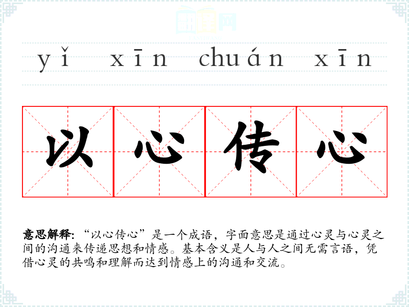 “以心传心”是一个成语,字面意思是通过心灵与心灵之间的沟通来传递思想和情感。基本含义是人与人之间无需言语,凭借心灵的共鸣和理解而达到情感上的沟通和交流。