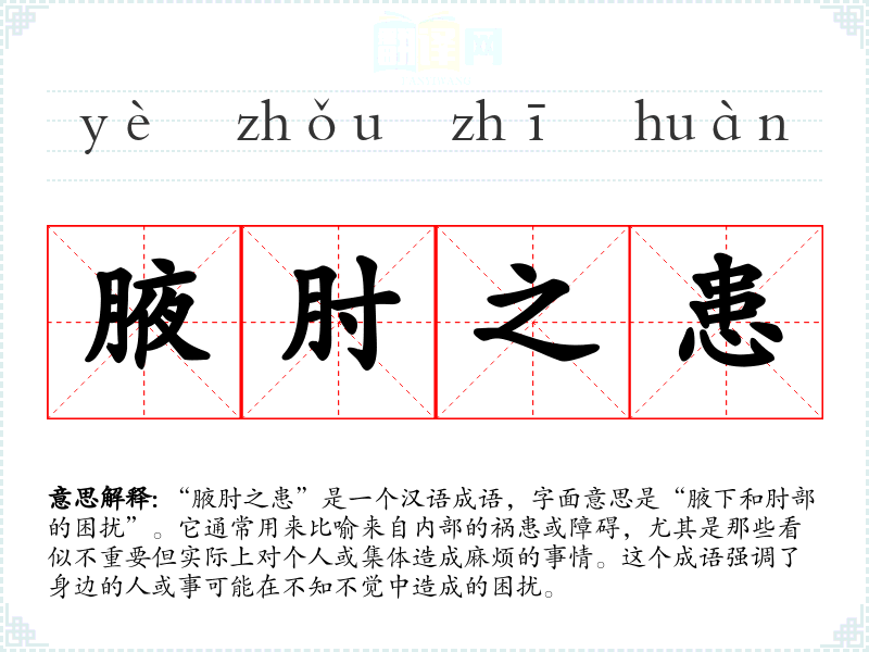 “腋肘之患”是一个汉语成语,字面意思是“腋下和肘部的困扰”。它通常用来比喻来自内部的祸患或障碍,尤其是那些看似不重要但实际上对个人或集体造成麻烦的事情。这个成语强调了身边的人或事可能在不知不觉中造成的困扰。
