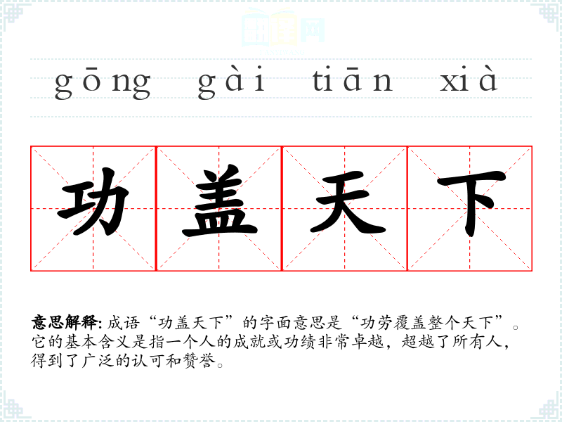 成语“功盖天下”的字面意思是“功劳覆盖整个天下”。它的基本含义是指一个人的成就或功绩非常卓越,超越了所有人,得到了广泛的认可和赞誉。
